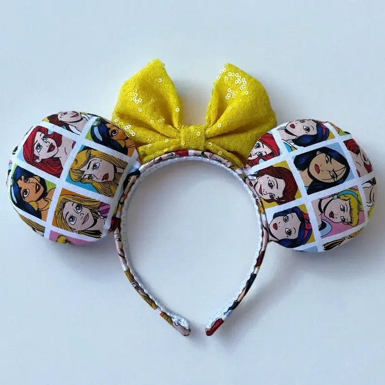 These gorgeous ears feature all of your favorite Disney Princesses. A yellow sequin bow completes the look. These ears sit in a one-inch headband with braided trim to ensure maximum comfortability and minimal slipping!