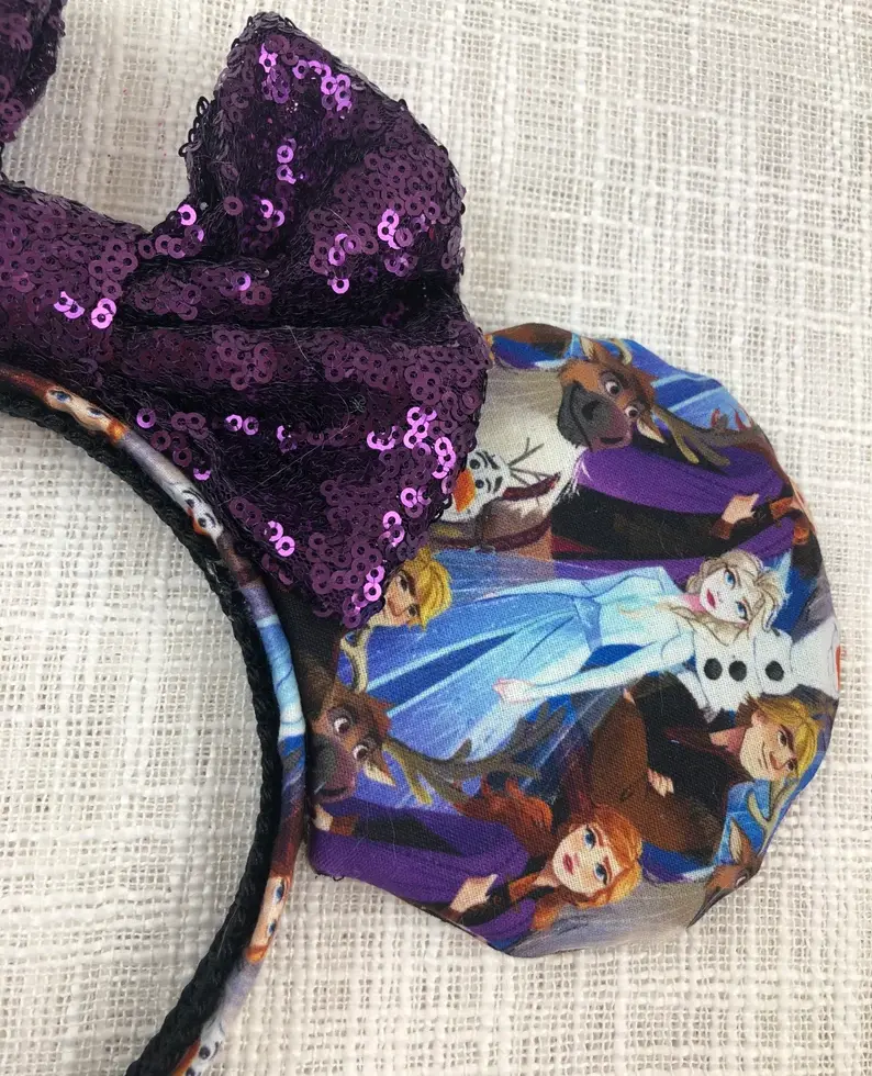 These amazing ears feature all of your favorite characters from Disney’s Frozen 2! Elsa, Anna, Kristof, Olaf and Sven feature on these ears with a deep purple sequin bow. The one-inch headband features braided trim on the inside to ensure comfortability with out any slipping!
