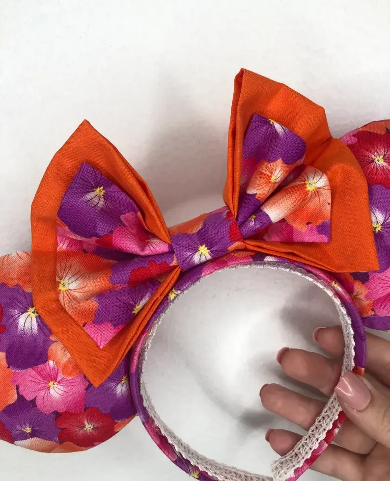 These super bright and fun minnie ears feature hibiscus flowers in a variety of colors! A double layer bow sits on top of the custom one inch headband. There is braided trim on the inside to ensure maximum comfort without any slipping!