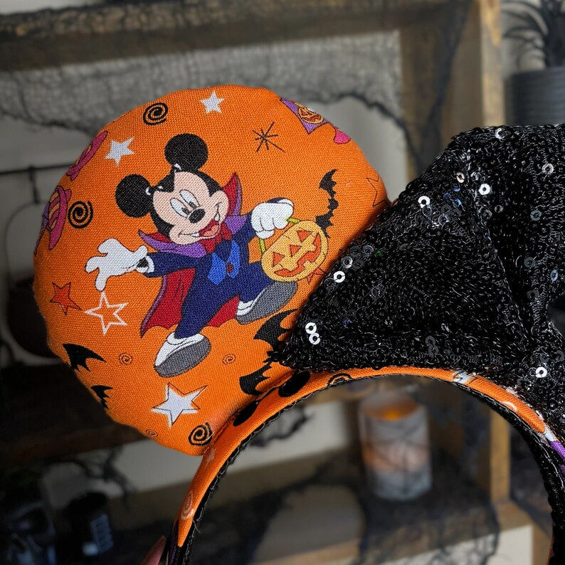 These orange Mickey and Minnie Halloween ears are perfect for spooky adventures at Disney! With Mickey as a vampier and Minnie as a witch, these Minnie ears will add the perfect touch to your ghoulish outfit. Black braided trim ensures your Halloween Disney ears stay put while still being comfortable enough for a rope drop to fireworks day. A black sequin bow completes the look!
