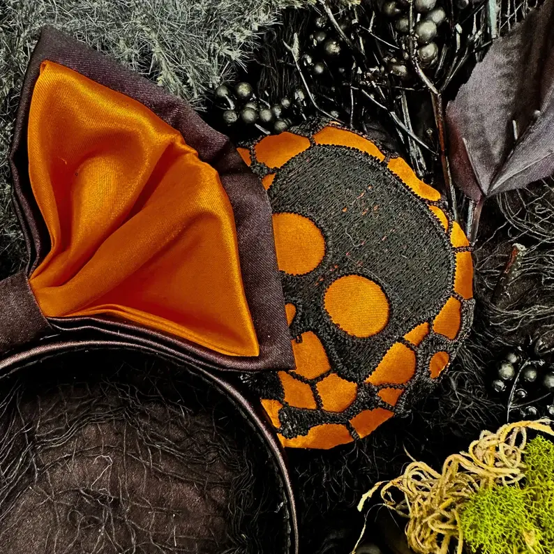 These orange and black Halloween Minnie ears feature skulls and plenty of customization options! These spooky skeleton Disney ears are perfect for a full day at the parks! A layered satin bow completes the look while black braided trim will ensure your ears stay put without giving you a headache.